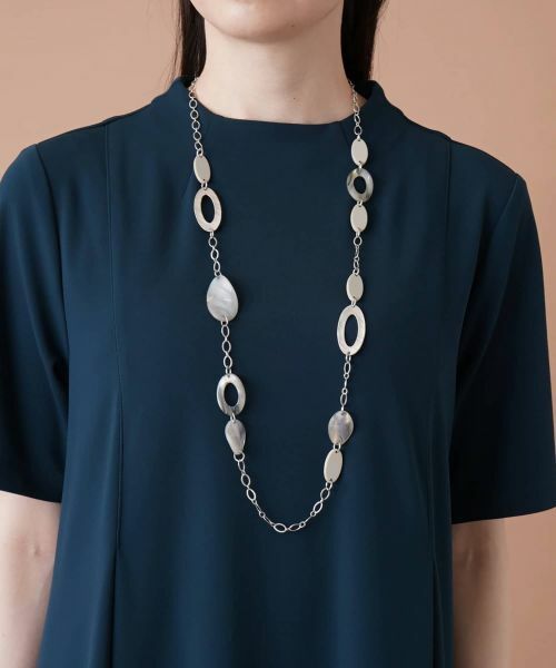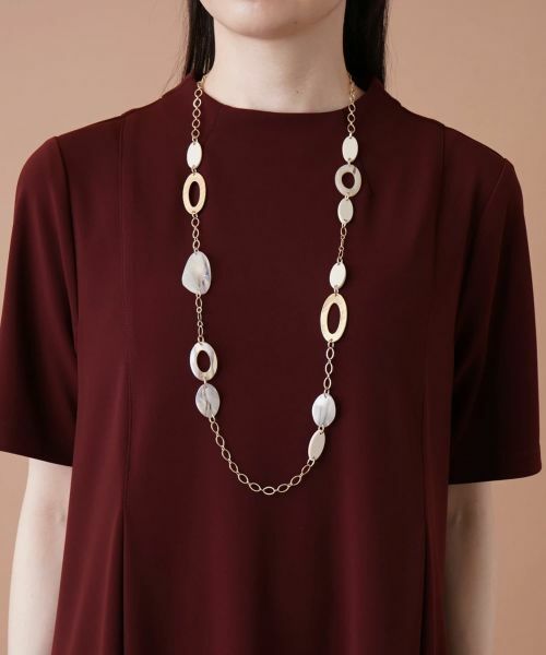 金属調パーツや樹脂リングをバランス良く繋いだロングネックレス。爽やかな雰囲気漂うデザインで、いつものコーディネートにも取り入れやすく、シンプルなトップスやワンピースのアクセントにもぴったりです。