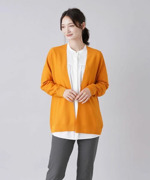 フロントノーボタンでデザインしたトッパータイプのカーディガン。ハイゲージの滑らかなニットの風合いも相俟って、大人の女性らしい上品なスタイリングを後押ししてくれる一枚です。シルエットに程よくゆとりを持たせているので自然なドレープ感があり、柔らかなニュアンスに仕上がります。カットソーやブラウスなど、合わせるインナーを選ばずにコーディネートしやすいのも嬉しいポイントです。