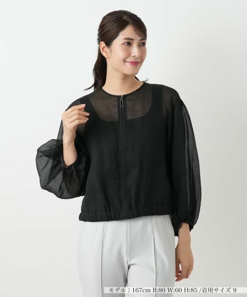 スポーティーなブルゾンを、繊細なシアー素材でぐっとフェミニンにアップデート。上品な透け感がインナーとのレイヤードスタイルをお洒落に見せてくれます。袖口と裾のゴムが、ふんわりとしたメリハリのあるシルエットを演出。カジュアルな中に、女性らしい柔らかな雰囲気をプラスします。冷房対策はもちろん、季節の変わり目のライトアウターとしてもフレキシブルに活躍。便利なポケット付きで、ご自宅で手洗いできる手軽さも嬉しいポイントです。