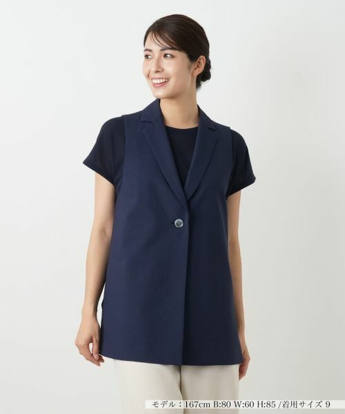 カットソーやブラウスの上にさっと羽織るだけで、大人の品格を添えてくれるラペルドベスト。きちんと感のあるノッチドラペルが顔周りをシャープに見せ、スタイリングを引き締めます。カットソーやニットの上に重ねるだけで、普段の着こなしがワンランクアップ。ワンピースに羽織ればオフィスにも対応できるきちんとスタイルに。薄手で軽やかな着心地なので、カーディガン感覚で気軽に羽織れます。初秋のレイヤードスタイルにぴったりのアイテムです。