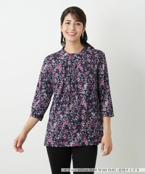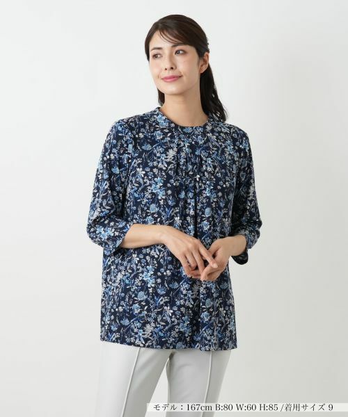 大人の女性を知的に彩る、シックなフラワー柄のブラウス。すっきりとしたバンドカラーに、フロントのタックが顔周りに優しい華やかさをプラス。程よくゆとりのあるシルエットが気になる身体のラインを拾わず、上品な着こなしを叶えます。しなやかな生地を使用しているため、着心地はストレスフリー。やや薄手で繊細な透け感が、初秋の着こなしに軽やかな抜け感を演出します。きれいめのパンツと合わせるだけで、洗練されたお出かけのスタイルが完成。バックネックはループボタンにより開閉が可能。