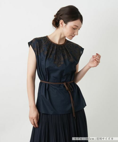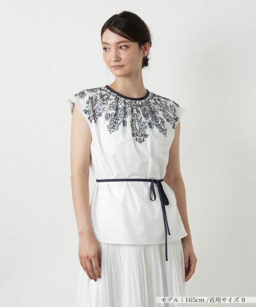 ヨーク部分に施された、繊細な花柄刺繍が顔周りを華やかに彩るブラウス。クラシカルな気品と程よい甘さを両立した主役級のトップスです。そのまま着れば気になる身体のラインを拾わない、ふんわりとしたシルエットに。付属の細リボンでウエストをきゅっとマークすれば、メリハリの効いたペプラム風の着こなしが楽しめます。肩先を上品にカバーしてくれるフレンチスリーブもポイント。きれいめのスカートやパンツと合わせれば、オフィスカジュアルから週末のお出かけまで幅広く対応します。