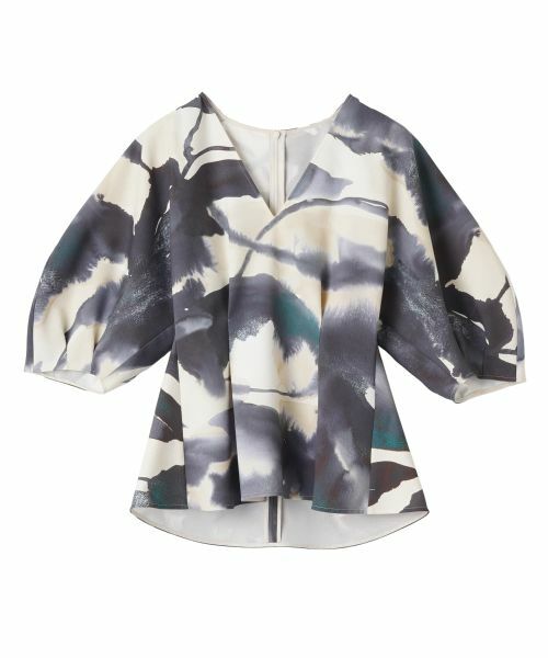 アーティスティックな柄が特徴で、Vネックが首元をすっきりと見せてくれます。ゆったりとしたシルエットとボリュームのある袖がトレンド感を演出。モノトーンや無地のボトムスと合わせると、トップスの柄が際立ち、スタイリッシュな印象に。アクセサリーはシンプルなものを選び、モダンな雰囲気を引き立てると◎。