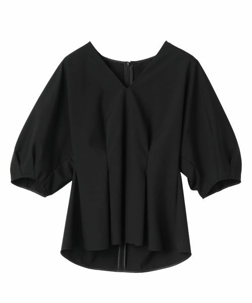 タックによってシェイプしたウエストラインやふわっと広がるペプラムヘム、ボリューミーなスリーブで、大人の女性の可愛らしさを演出するブラウス。顔周りには深めのVネックでシャープさを取り入れています。