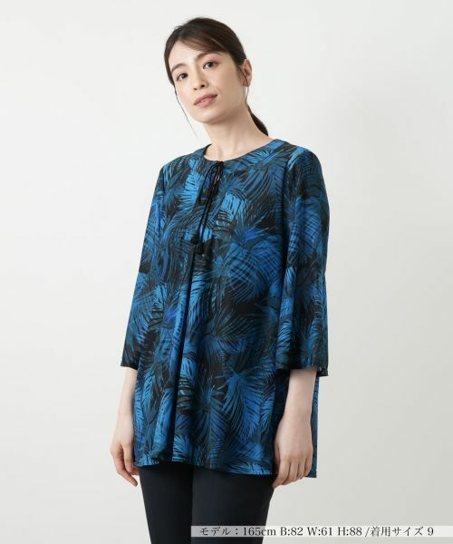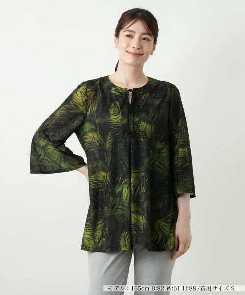 リーフモチーフがベースカラーに映え、着る人をドラマティックに彩るブラウス。薄手で軽やかな生地は、透け感があることで程よい抜け感を演出し、涼やかな着心地をキープ。ゆったりとしたフレアシルエットが、気になるボディラインを優しくカバーしつつ、動きに合わせて優雅に揺れるドレープが女性らしい華やかさをプラス。デイリーカジュアルにはもちろん、きれいめなパンツやスカートと合わせれば、洗練されたお出かけスタイルにも活躍する一枚です。