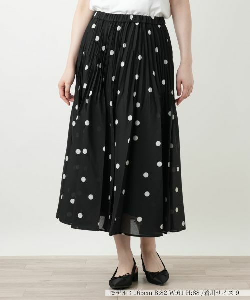 ドット柄とプリーツ幅を巧妙に切り替えたデザインが、ドラマティックな表情を生み出すスカート。やや薄手の軽やかな生地感で、しなやかな風合いが優雅なドレープを演出し、女性らしい柔らかな印象を与えます。ウエストはすべてゴム仕様なので、締め付け感がなく快適な穿き心地を実現。膝下丈のミディレングスは、上品さとトレンド感を両立。トップスをインしてすっきりと見せたり、ゆったりとしたニットやブラウスと合わせたりと、幅広い着こなしが楽しめます。