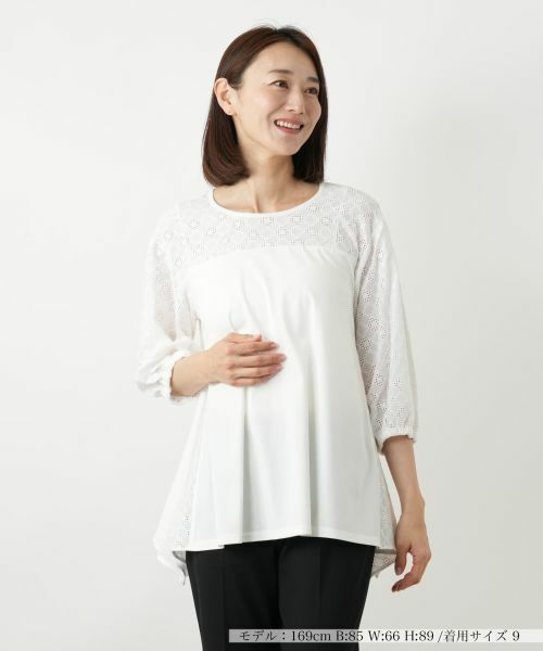 初秋のスタイリングに涼やかなアクセントを添える、部分的にレースで切り替えたカットソー。袖やヨーク部分にあしらわれた繊細なレースが、シンプルなデザインに上品な透け感とフェミニンな魅力をプラス。身頃には伸縮性のある素材を使用し、快適な着心地を実現します。インナーとのレイヤード次第で様々な表情を楽しめます。袖口にはゴムが入っているので、袖をたくし上げてボリューム感を調整できます。