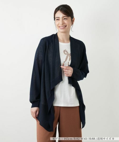 前身頃が優雅に流れるイレギュラーヘムのカーディガン。動くたびにふわりと揺れ、女性らしい柔らかな表情を演出します。コットン、ポリエステル、麻、ナイロンをブレンドしたさらりとした素材は、薄手で程よい透け感があり、涼やかな着心地をキープ。細やかなボーダー部分には繊細なラメ糸を編み込んでいるため、光を受けるたびにさりげなく煌めき、顔周りやバックスタイルを華やかに彩ります。前留めなしのデザインなので、Tシャツやブラウスの上にさっと羽織るだけで、ぐっとこなれた印象に仕上がります。