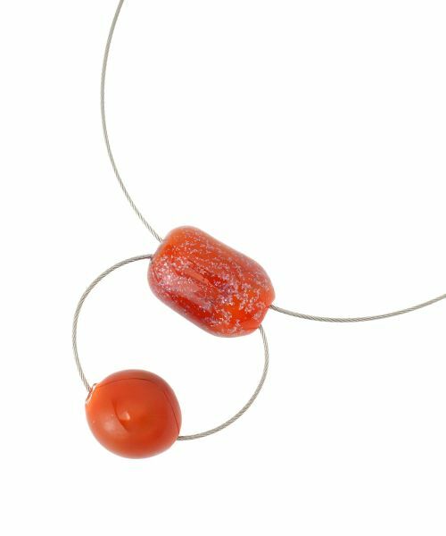 ワイヤー特有のしなやかさと張りを活かして、構築的なフォルムに仕上げたネックレス。それぞれ表情の異なる石のようなガラス調パーツを2つ使用し、シンプルかつモダンな印象のアクセサリーです。