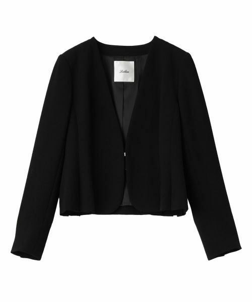 フクレ二重織の素材を使用したセレモニージャケットです。収縮率の違う2種類の糸を縮ませることで表面に凹凸を出しており、とてもしなやかで軽量に仕上がっています。シンプルなノーカラーですが、ウエストラインをきれいに見せるシルエットがポイント。パネル切り替えの裾がボックスプリーツとなったり、ペプラムのようになったりと、エレガントかつ優しげな表情を楽しめるアイテムです。フロントはラインストーン入りホックにより開閉が可能。