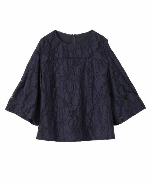 トルコの「Nurel Tekstil(ヌレル テキスタイル)」社の「JADE(ジェイド)」というレースブランドのレースを使用したプルオーバーブラウス。ラッセルレースにコード刺繍を施した華やかなレース素材は、大胆なフラワーモチーフが新鮮。フレア袖にも裏を付けているため、程よい透け感があり、エレガントな雰囲気に仕上がります。上品さを感じさせるネイビーカラーで合わせやすく、一枚でサマになるパワーブラウスです。バックファスナーにより開閉が可能。