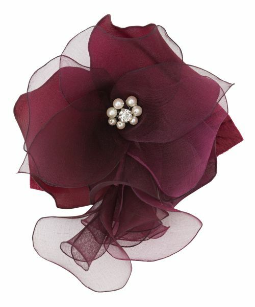 繊細な美しさを放つ薄手の布で作られたコサージュ。中央には輝くパーツとパール調モチーフをトッピングし、上品な華やかさをプラス。ジャケットやストール、帽子など、様々なアイテムに付けられ、お洒落を後押しします。