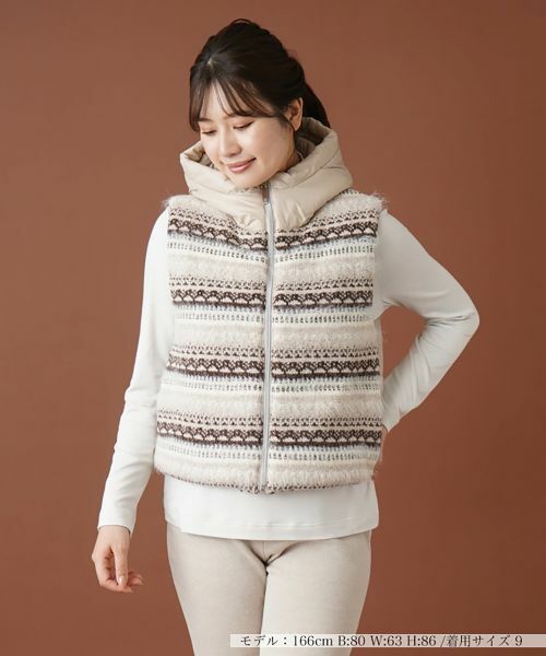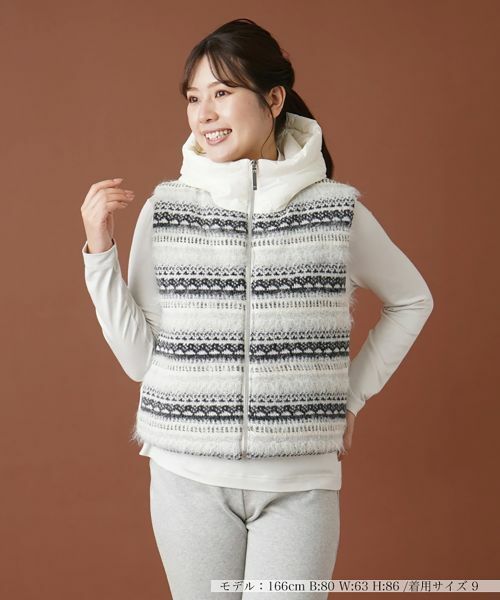 北欧調のフェアアイル柄ニットがシーズンムードを盛り上げる中わた入りのフーデッドベスト。すっきりとしたコンパクトな丈感で着こなしやすく、大きめのフードがインパクト大。バックウエストはゴム仕様とし、心地よいフィット感をもたせました。フロントはファスナーによりスムーズに着脱が可能。ひと味違ったカジュアルルックが手軽に楽しめるアウターです。
