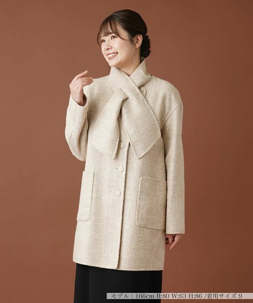 ハウンドトゥース柄とメランジ調のリバーシブルで着用できる、厚手のアルパカ混生地を使用したノーカラーコート。同素材のティペットがセットになっており、お好みに応じてアレンジして楽しめます。ドロップショルダーでシルエットに程よいリラックス感をもたせており、肩肘張らないストレスフリーの着心地を実現しています。フロントにマーブルボタンを採用し、細部までこだわりを感じさせるデザインに。オンオフを選ばず多彩なシーンで活躍するアウターです。