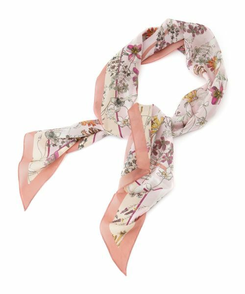 水彩画のようなタッチで描かれたボタニカル柄が、顔周りを華やかに彩るプリントスカーフ。美しいカラーの縁取りが全体を引き締め、コーディネートのアクセントとして最適です。上品な光沢のある生地は滑らかな肌触りで、付け心地も抜群。首元に巻くのはもちろん、バッグのハンドルに結んだり、ヘアアレンジに加えたりと、一枚で多彩なスタイリングが楽しめます。シンプルな装いにプラスするだけで、ぐっと洗練された印象に仕上がります。