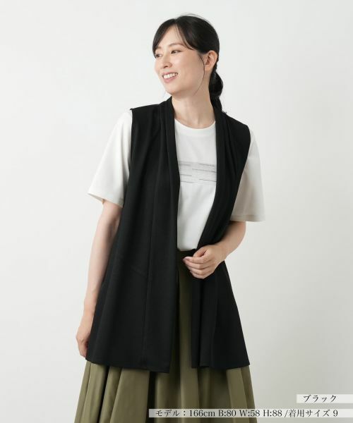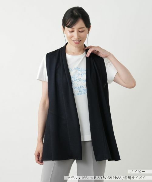 コーディネートに一枚重ねるだけで、ぐっとこなれた印象に仕上がるベスト。ボタンのないデザインと、そこから生まれる美しいドレープが、エレガントな雰囲気を演出します。縦長のIラインシルエットは、気になるヒップ周りやボディラインをスマートにカバー。伸縮性に優れたやや薄手の素材で、秋口のTシャツやブラウスの上に羽織るのにぴったりです。ご自宅で手洗い可能なイージーケア仕様で、普段使いに重宝するアイテムです。