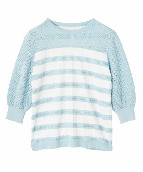 涼しげな透かし柄編みとシーズンらしいボーダー柄が爽やかにマッチした7分袖ニットプルオーバー。やりすぎ感なくスタイリングできてちょっぴり個性もアピールできる仕上がりは、手持ちのボトムスとのワンツーコーデでもきちんとオシャレに。