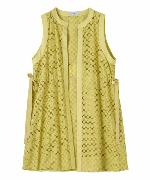フロントノーボタンで仕上げた軽やかな印象のロングジレ。ジオメトリックモチーフのオリジナルボーラーレース素材を使用しているので、程よい透け感があり涼やかなニュアンスに。ウエストはグログランリボンのドローストリングにより絞りが入れられます。Tシャツやカットソーの上からさらっと羽織りやすく、夏に向けてのレーヤードスタイルにおすすめのアイテムです。