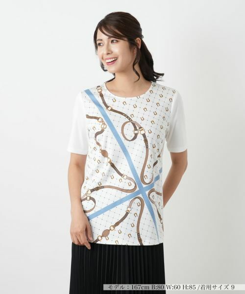 スカーフのような華やかな柄を落とし込んだプリントカットソー。格子柄を背景にヴィンテージ感溢れるベルトと、幸運のモチーフとされる蹄鉄を組み合わせたクラシカルなデザインが魅力です。後ろ身頃を無地で切り替えているのもポイントです。ジャケットのインナーとしても映え、コーディネートを品よく格上げしてくれます。