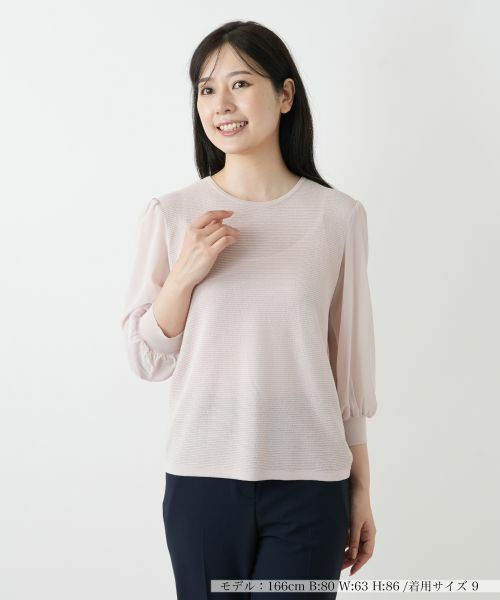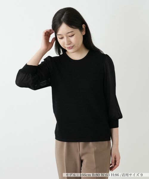 ニットの上品さに、シアーな抜け感をプラスした主役級の一枚。身頃は表情豊かな編地ですっきりと、対照的に袖はシアー素材で切り替え、軽やかな印象に仕上げました。肩と袖口のギャザーが生み出す、ふんわりとしたボリュームスリーブが、気になる二の腕をカバーしつつ、女性らしい手元を演出します。適度に伸縮性があり着心地も快適。きれいめボトムスと合わせるだけで、オフィスにも映える洗練された秋スタイルが完成します。