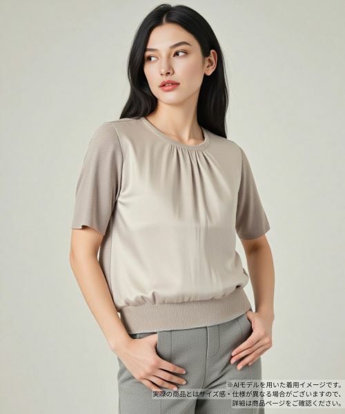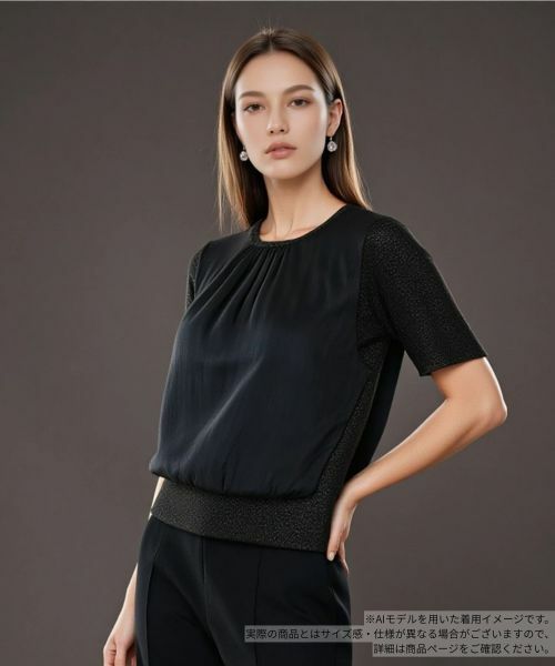 ブラウスのような上品な前身頃と、煌めくラメニットをドッキングした、華やかなプルオーバー。フロントの素材感とネックラインのギャザーが、女性らしい柔らかな印象を与えます。袖や後ろ身頃には繊細なラメ糸を織り込んだニットを使用し、さりげない輝きをプラス。ニットならではの伸縮性もあり、きちんと見えと快適な着心地を両立します。一枚で着映えし、ジャケットのインナーとしても活躍する、オンオフ頼れるアイテムです。