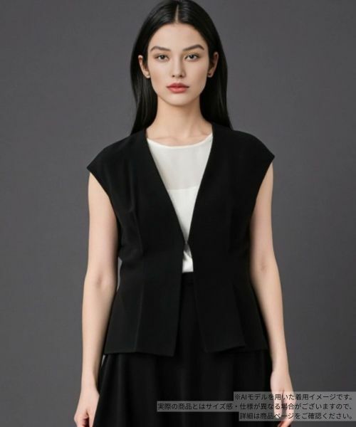 ウエストからしなやかに広がる、ペプラム風デザインが美しいVネックベスト。やや短めの丈感でありながら高い位置でウエストをシェイプすることで女性らしいくびれが出現し、スタイルアップ見えするシルエットになります。顔周りをすっきりと見せるシャープなネックと、肩を優しく覆うようなカッティングが上品な印象です。シンプルなトップスに重ねるだけで、着こなしがぐっと華やかになります。同素材のボトムスと合わせた、セットアップスタイルもおすすめです。