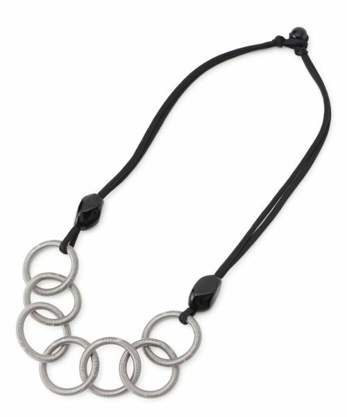 フープ状のスプリングパーツを組み合わせ、抜け感のあるデザインに仕上げたロングネックレス。石を模したアクリルパーツやアセテート樹脂のコードなど、異なる素材の組み合わせを楽しめるアイテムです。