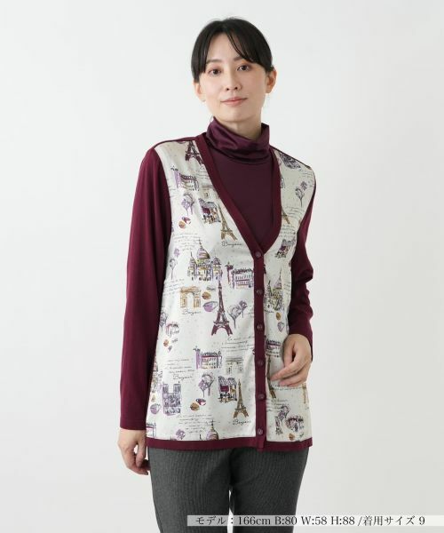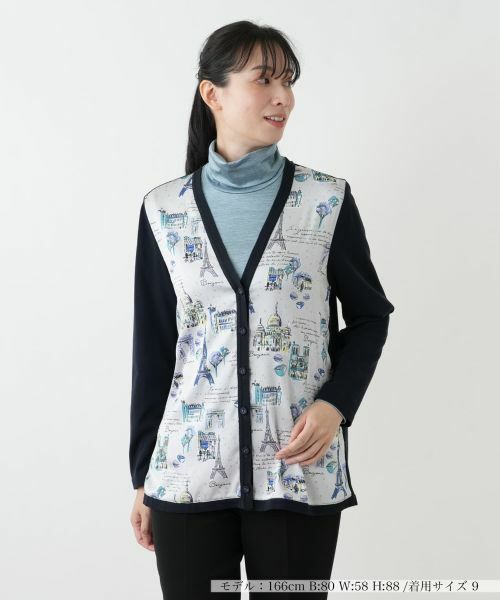 パリの街並みを描いた華やかなイラストが目を惹く、フロント切替のVネックカーディガン。前身頃は上品な織地、袖と後ろ身頃は柔らかなニットで快適な着心地が感じられる一枚です。前身頃の織地にも伸縮性があり、動きやすさも抜群。薄手仕立てなので季節の変わり目にさっと羽織れ、インナーとの様々な組み合わせを楽しめます。コーディネートの主役になれる、大人顔のトップスです。