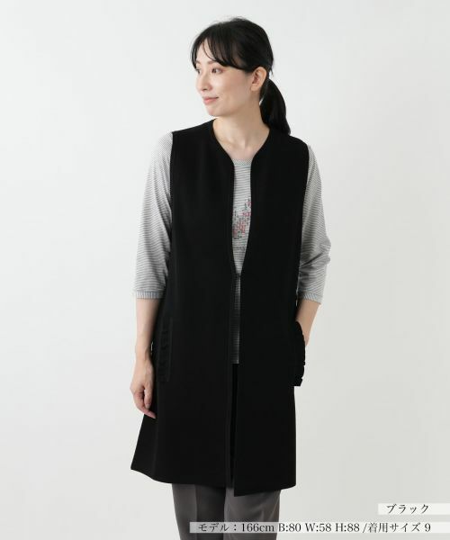 縦のラインを強調し、すっきり見えを叶えるロングベスト。シンプルなノーカラーデザインに、両サイドのポケットにあしらったフリルが、大人可愛いアクセントを効かせます。すとんと落ちるIラインシルエットが、気になるウエスト回りやヒップをカバーし、スタイルアップを実現。伸縮性のある柔らかな素材で着心地もよく、サイドスリット入りで足捌きも軽快です。いつもの着こなしにプラスするだけで、ぐっとこなれた秋のレイヤードルックが完成します。