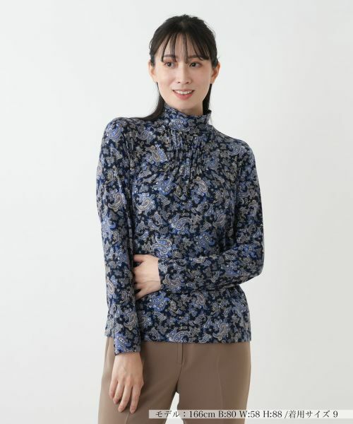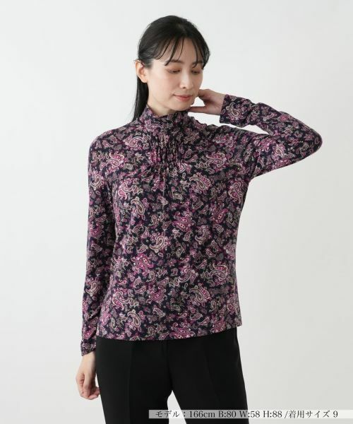シックなペイズリー柄が、秋の装いに深みと華やかさをプラスする大人のためのエレガントなカットソー。首元から胸元にかけて寄せた繊細なシャーリングが顔周りを引き立て、優美なドレープを生み出す計算されたデザインがポイント。伸縮性に優れた滑らかな生地が心地よく身体にフィットし、美しいシルエットをキープします。ジャケットのインナーとしても存在感を発揮し、コーディネートを品よく格上げする主役級のトップスです。