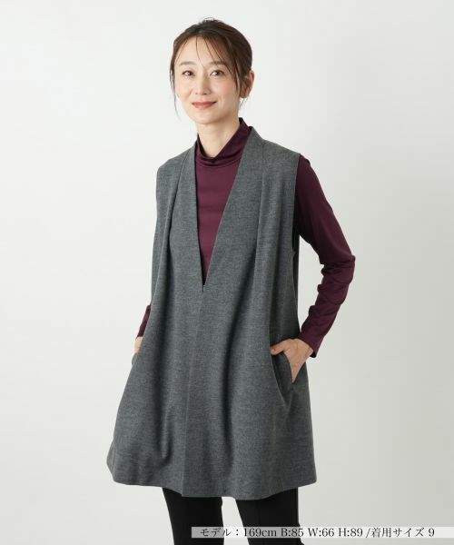 Aラインに美しく広がるシルエットが、ボディラインをナチュラルかつエレガントにカバーしてくれるロング丈のフレアベスト。シャープなVネックが顔周りをすっきりと見せ、全体の印象を引き締めます。いつものコーディネートにさっと羽織るだけで、ワンランク上のこなれたレイヤードスタイルが完成する、これからの季節にぴったりの一枚です。