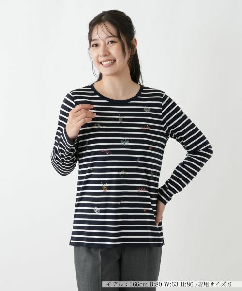 爽やかなボーダーカットソーに、遊び心あふれる刺繍を散りばめた一枚。フロントに、スパンコールやホットフィット、色とりどりの刺繍を組み合わせて様々なモチーフをデザインしています。伸縮性のある柔らかな素材で、着心地の良さも嬉しいポイント。定番のボーダーはどんなスタイルにも合わせやすく着回し力も抜群。程よく身体にフィットするベーシックなシルエットで、ジャケットやカーディガンのインナーとしても活躍します。