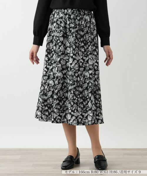 まるで絵画のようなアートな雰囲気のプリントが目を惹く、フレアスカート。シックなカラーで描かれた抽象的な柄は、華やかでありながらも上品な印象を与えます。ウエストから裾に向かって優雅に広がるフレアシルエットが、動くたびに美しいドレープを描いて女性らしさを引き立てます。ウエストは総ゴム仕様でストレスフリーな穿き心地をキープ。シンプルなトップスを合わせるだけで着映えし、オンオフ問わず活躍してくれそうです。