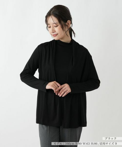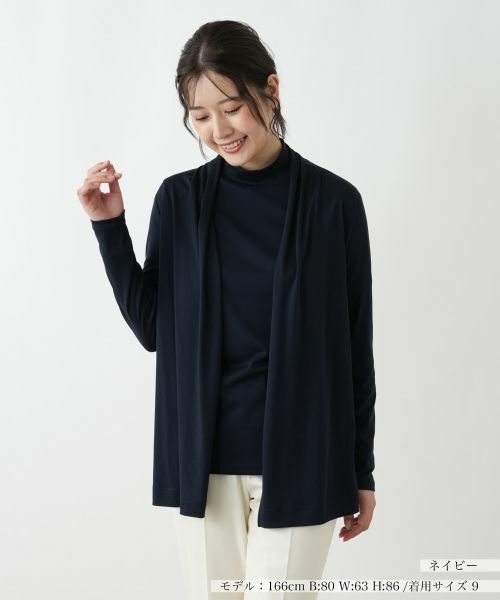 フロントボタンを取り付けない、流れるようなドレープが美しいノーボタンカーディガン。さっと気軽に羽織るだけで、縦のラインを強調したすっきりとした着こなしが完成します。気になるヒップ周りを自然にカバーしてくれる着丈も嬉しいポイント。やや薄手の滑らかなコットンを使用しており、動きやすくストレスフリーな着心地です。裾にあしらったさりげないロゴプレートが上品なアクセントに。オンオフ問わず多彩なスタイルに合わせやすい、着回し力抜群の一枚です。