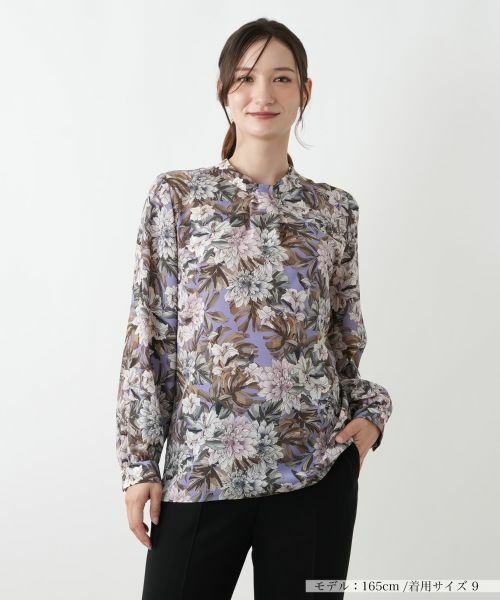 水彩画を思わせる繊細な花柄プリントが、顔周りを華やかに彩るブラウス。ネック中央に寄せたドレープ風のディテールが、さりげなくも上品なアクセントを添えます。美しい落ち感も相俟って、女性らしいシルエットを演出。一枚で主役になるのはもちろん、ジャケットのインナーとしても映え、着こなしをエレガントに格上げしてくれます。秋のオフィスから週末のお出かけまで幅広く活躍するトップスです。