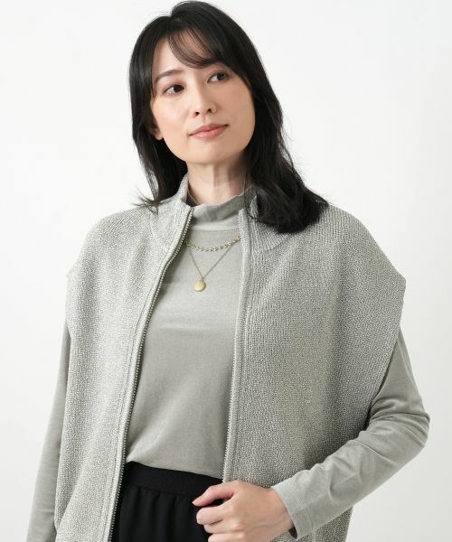 繊細なラメの煌めきが、さりげなくリュクスな雰囲気を漂わせるジップニットベスト。肩先を優しく覆うフレンチスリーブ風のデザインが、女性らしいシルエットを演出します。ブラウスやカットソーに重ねるだけで、暖かさとお洒落を両立したレイヤードスタイルが完成。バックネックのメタルプレートもさりげないアクセントに。これからの季節のコーディネートに、華やかさをプラスする一枚です。