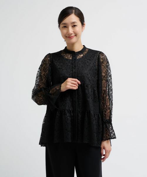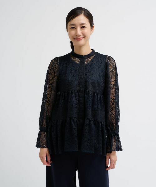 国内生産のレース素材を使用したエレガントなブラウス。どのようなシーンにも溶け込む、着るだけで華やかなティアードデザイン。一枚で着ても、ジャケットのインナーとしても、サマになる汎用性の高さが魅力です。アンダータンクトップ付きで、身体のラインを拾わないゆったりしたシルエットと、ヒップラインが隠れる丈感がポイント。流行に左右されない上質なベーシックアイテムなので長く寄り添う一着として、ワードローブに加えてみてはいかがでしょうか。※商品の色味は、撮影場所や光のあたり具合、お客様のお使いの機器により色味が違って見える場合がございます。予めご了承ください。