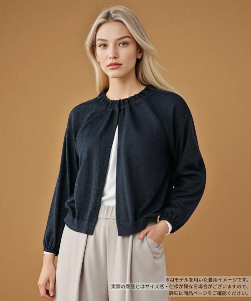 繊細なラメの煌めきと顔周りを華やかに見せるフリルネックが、女性らしいエレガントな雰囲気を引き立てるカーディガン。ボタンを留めてブラウスのように、開けてボレロのように羽織っても素敵です。しなやかな薄手のニット素材なので着心地は軽やか。お手持ちのインナーを合わせて、上品な透け感を活かしたレイヤードルックも楽しめます。これからの季節のコーディネートをフェミニンに格上げしてくれる、主役級の一枚です。