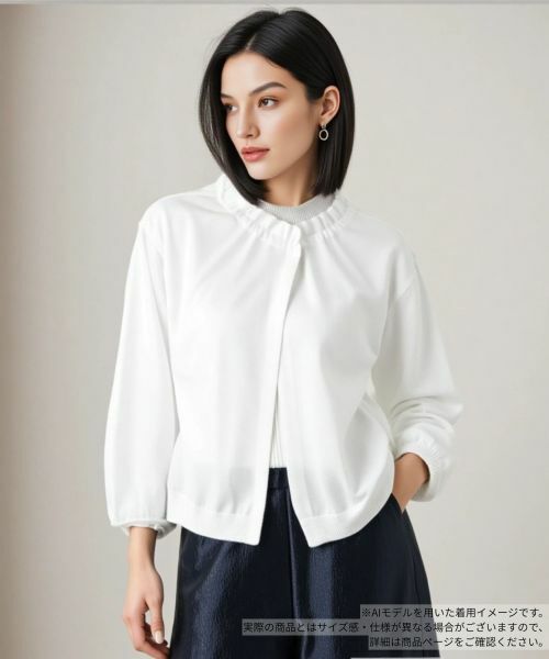 ネックラインのフリルと、繊細なラメの煌めきが顔周りを華やかに見せるカーディガン。ボタンを留めてブラウス風に、さっと羽織ってボレロのようにと、お好みでコーディネートのアレンジを楽しめます。しなやかな薄手のニットは季節の変わり目にぴったり。インナーを合わせて軽やかな透け感を活かしたレイヤードスタイルもおすすめ。いつもの装いをぐっとフェミニンに格上げしてくれるアイテムです。