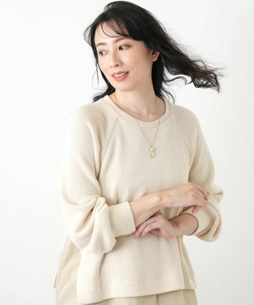 ニットとシャツを重ね着したようなドッキングデザインのプルオーバー。表情豊かな編地のニットは、ふんわりとしたボリュームスリーブが女性らしい柔らかな雰囲気を演出します。裾から覗くシャツ風の素材が、気になるヒップ周りをさりげなくカバーしつつ、軽やかな抜け感をプラス。計算された丈のバランスと深めのサイドスリットにより、細身のパンツからワイドパンツまで好相性です。忙しい朝にも迷わずお洒落が楽しめる、ワードローブの強い味方になってくれそうなトップスです。