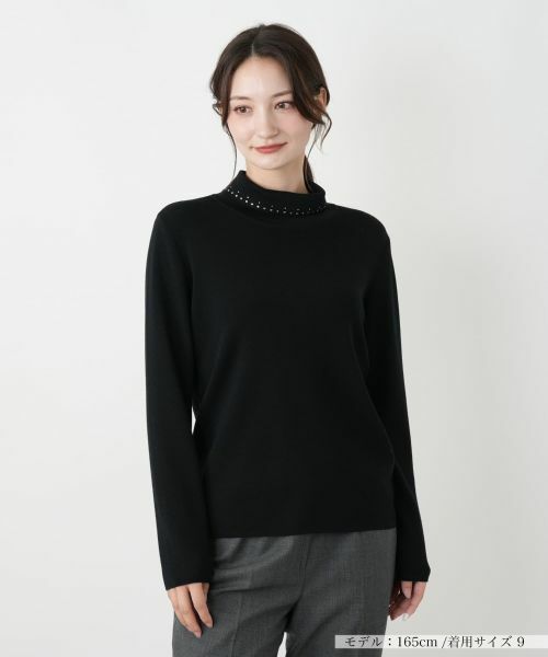 ネックラインに沿ってあしらわれたラインストーンが、顔周りにさりげない輝きを添えるハイネックカットソー。アクセサリーなしでも華やかな印象を与え、コーディネートを上品にクラスアップさせてくれます。伸縮性のある生地がボディに優しくフィットし、快適な着心地を実現。一枚ではもちろん、ジャケットやジレのインナーとして首元からラインストーンをキラリと覗かせるのもおすすめ。オンオフ問わず活躍する、エレガントな一枚です。------------------------------------着用シーズン:秋 伸縮性:あり透け感:なしポケット:なし生地の厚さ:やや薄手裏地:なし-------------------------------------※商品の色味は、撮影場所や光のあたり具合、お客様のお使いの機器により色味が違って見える場合がございます。予めご了承ください。家庭洗濯不可漂白不可タンブル乾燥不可アイロン低温160℃まで石油系溶剤ドライクリーニング弱ウェットクリーニング不可