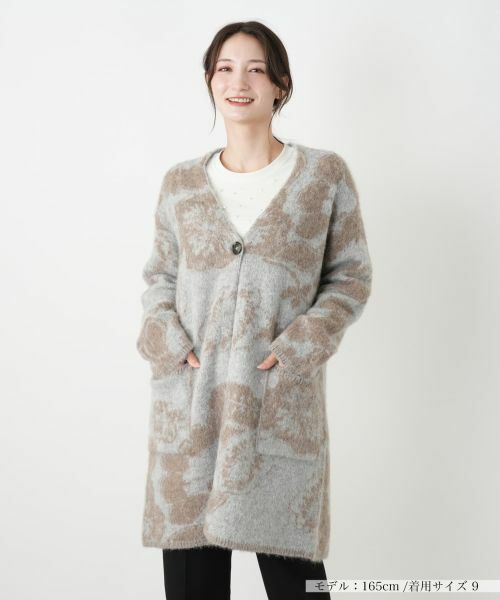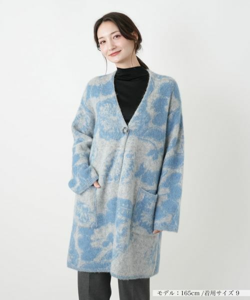 イタリアのニットブランド「BIANCA LANCIA」より届いた、花柄が印象的なVネックニットジャケット。アルパカをブレンドした起毛感のある素材が、見た目にも温かな表情を演出。すっきりとしたVネックとヒップまで隠れるリラックス感のあるロング丈が大人の余裕を感じさせるデザインとなっており、季節の変わり目にはアウターとしても活躍。さっと羽織るだけでコーディネートが華やぐ、主役級のアウターです。------------------------------------着用シーズン:冬 伸縮性:あり透け感:なしポケット:あり生地の厚さ:やや薄手裏地:なし-------------------------------------※商品の色味は、撮影場所や光のあたり具合、お客様のお使いの機器により色味が違って見える場合がございます。予めご了承ください。家庭洗濯不可漂白不可タンブル乾燥不可アイロン不可石油系溶剤ドライクリーニング弱ウェットクリーニング不可