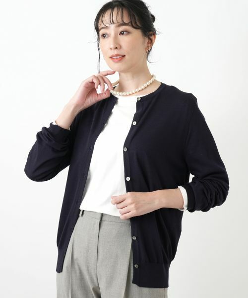 多彩なコーディネートに合わせやすい、ベーシックなデザインのクルーネックカーディガン。やや薄手の生地なので羽織りものやアウターのインナーとしても最適。伸縮性があるため動きやすく、快適な着心地を約束します。ボタンを全て留めてプルオーバーとして着こなすのはもちろん、肩掛けにしてスタイリングのアクセントにするのもおすすめ。オンオフ問わず着回せる、ワードローブに一枚あると重宝するアイテムです。