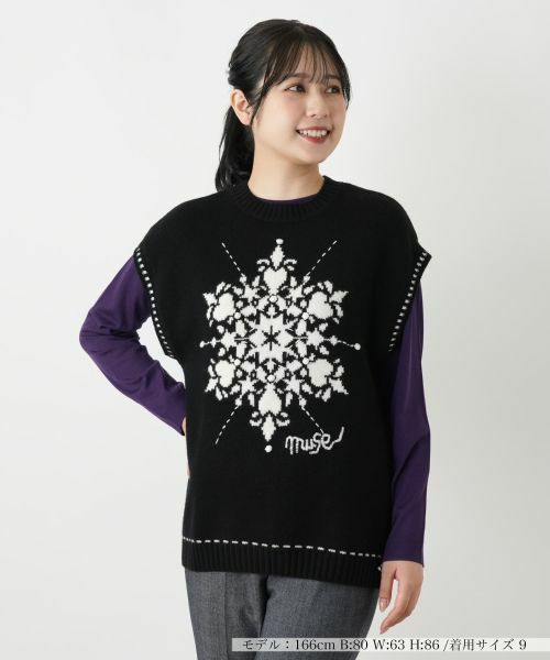 雪の結晶モチーフが目を惹く、表情豊かなニットベスト。結晶の中心や周囲にはドットがあしらわれ、可愛らしさをプラスしています。裾に添えられた「muse」の筆記体ロゴも、さりげないアクセント。アームホールに少しゆとりを持たせたデザインで、ボリュームスリーブのブラウスやカットソーとのレイヤードももたつかず楽しめます。インナー次第で様々な表情を見せる、冬のレイヤードスタイルに活躍する一枚です。