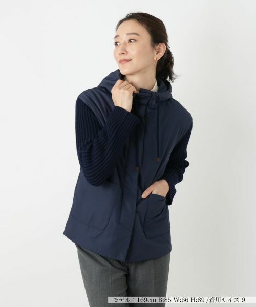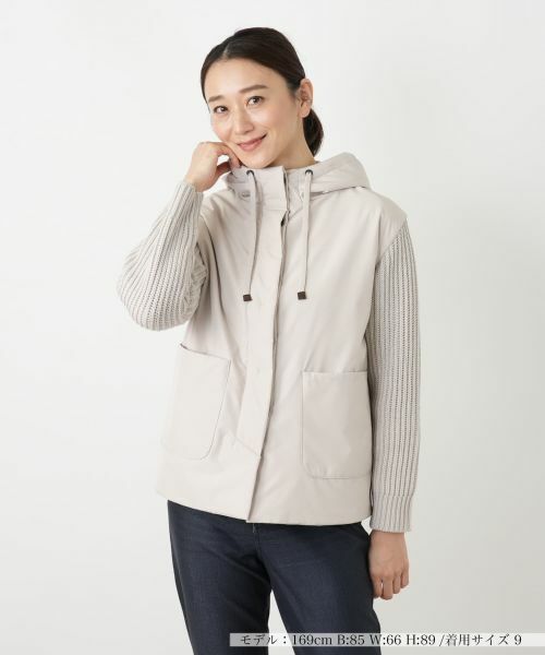 異素材のコンビネーションが目を惹く、フーデッドジャケット。前身頃やフード、背中のヨーク部分はハリのある布帛素材、袖と背中部分はリブニットで切り替え、表情豊かに仕上げました。厚手のしっかりとした生地感なので、これからの肌寒い季節のアウターとしてフレキシブルに活躍します。フロントの大きなパッチポケットが実用的なアクセントに。さっと羽織るだけで、こなれたカジュアルスタイルが決まるデザイン性の高い一着です。------------------------------------着用シーズン:秋伸縮性:前身頃 後身頃ヨークなし、後身頃 スリーブあり透け感:なしポケット:あり生地の厚さ:厚手裏地:なし付属品:フード取り外し不可-------------------------------------※商品の色味は、撮影場所や光のあたり具合、お客様のお使いの機器により色味が違って見える場合がございます。予めご了承ください。家庭洗濯不可漂白不可タンブル乾燥不可アイロン不可石油系溶剤ドライクリーニング弱ウェットクリーニング不可
