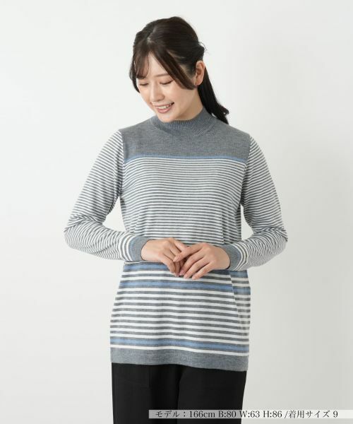 ランダムなボーダー柄がモダンな印象を与えるハイネックニットです。肌触りの良い天竺組織で丁寧に編み上げられており、ソフトな肌触りが特徴です。ボーダーの一部には繊細なラメ糸が織り込まれており、動くたびに上品な光沢を放ちます。一枚で着ても、インナーとしてレイヤードしても、洗練された印象を与えます。快適な着心地とデザイン性を両立した、長くご愛用いただける品質です。------------------------------------着用シーズン:秋伸縮性:あり透け感:なしポケット:なし生地の厚さ:やや厚手-------------------------------------※商品の色味は、撮影場所や光のあたり具合、お客様のお使いの機器により色味が違って見える場合がございます。予めご了承ください。家庭洗濯不可漂白不可タンブル乾燥不可アイロン低温120℃まで石油系溶剤ドライクリーニング弱ウェットクリーニング不可