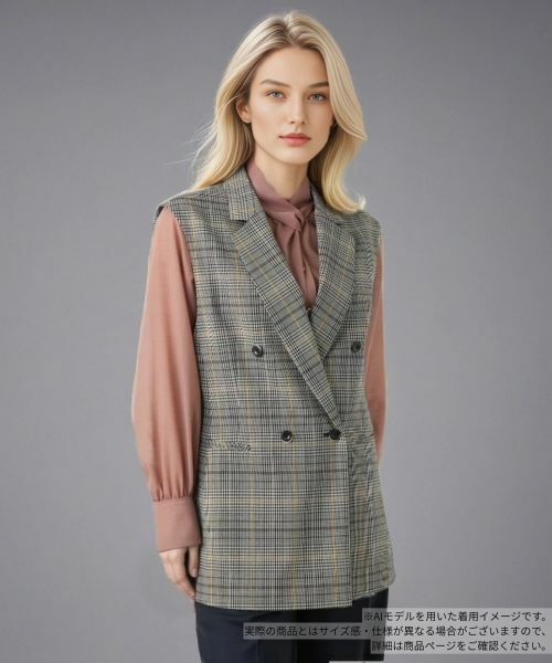 ダブルブレストのデザインが目を惹く、クラシカルなチェック柄のロングベスト。トラッドな雰囲気漂うグレンチェックが、コーディネートを格上げしてくれます。ヒップまで隠れる長めの着丈は、気になる体型をカバーしつつ縦のラインを強調。深めのバックベンツが動きやすさとこなれた抜け感をプラスします。ブラウスやニットの上にさっと羽織るだけでいつものスタイルをお洒落な印象に。同素材のパンツと合わせたセットアップもおすすめです。