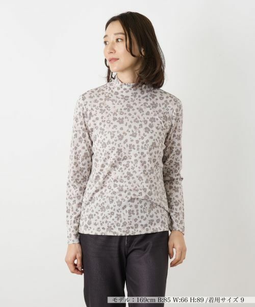 イタリア「Cariaggi」社の上質な素材を使用したハイネックカットソー。毛、シルク、カシミヤをブレンドした薄手の生地は、ストレッチ性にも富み、格別な肌触りを実現しています。全面に施されたレオパードのようにも見える小花柄のプリントが、コーディネートに華やかなアクセントをプラス。首元をすっきりと見せるネックラインもポイントです。程よい透け感があるため、インナーとのレイヤードをお楽しみいただけます。------------------------------------着用シーズン:秋伸縮性:あり透け感:ありポケット:なし生地の厚さ:薄手裏地:なし-------------------------------------※商品の色味は、撮影場所や光のあたり具合、お客様のお使いの機器により色味が違って見える場合がございます。予めご了承ください。家庭洗濯不可漂白不可タンブル乾燥不可アイロン低温160℃まで石油系溶剤ドライクリーニング弱ウェットクリーニング不可