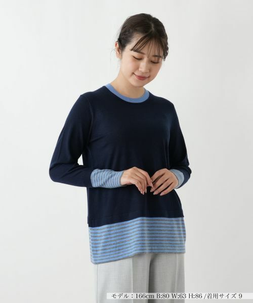 袖口と裾から覗くボーダー柄がアクセントになった、クルーネックニット。絶妙なバランスの切り替えが印象を明るく見せてくれそうです。伸縮性のあるやや薄手のニット素材で透け感を気にせず着心地も快適。一枚でさらりと着こなすのはもちろん、冬はジャケットやコートのインナーとしても活躍し、ロングシーズン着回せます。シンプルなボトムスと合わせるだけで、コーディネートに変化を加えてくれるトップスです。