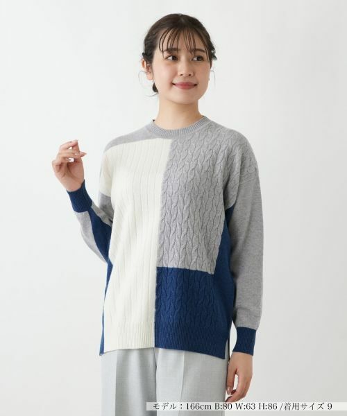 リブ編みとケーブル編みを大胆に切り替えた、表情豊かなクルーネックニットプルオーバー。ブロッキングデザインが目を惹き、スタイリングの主役になります。背面はシンプルなカラーブロックですっきりと仕上げており、前後で異なる印象を楽しめます。伸縮性のあるやや薄手のニット地で、秋に一枚で着るのはもちろん、冬のインナーとしても活躍。パンツにもスカートにも合わせやすい丈感で、デイリーユースにぴったりのトップスです。------------------------------------着用シーズン:秋 伸縮性:あり透け感:なしポケット:なし生地の厚さ:やや薄手裏地:なし-------------------------------------※商品の色味は、撮影場所や光のあたり具合、お客様のお使いの機器により色味が違って見える場合がございます。予めご了承ください。家庭洗濯不可漂白不可タンブル乾燥不可アイロン低温160℃まで石油系溶剤ドライクリーニング弱ウェットクリーニング不可